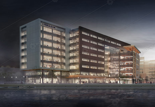 Ferguson Enterprises Headquarters is the corporate hub for the largest U.S. supplier of plumbing, heating, air conditioning, and other appliances.Advenser’s involvement in this project centered on the development of detailed shop drawings using AutoCAD. The façade system utilized captured and structural glazed curtainwall and storefront systems, along with doors, designed to meet both aesthetic and functional requirements.The project presented coordination challenges due to the number of interconnected and angled frames. Additionally, provisions for sunshade installations were included, requiring careful detailing for future integration by others. Custom anchors were also required to ensure stability and alignment with the building’s unique design. Advenser worked meticulously to address these challenges, delivering precise drawings that met the project’s complex specifications